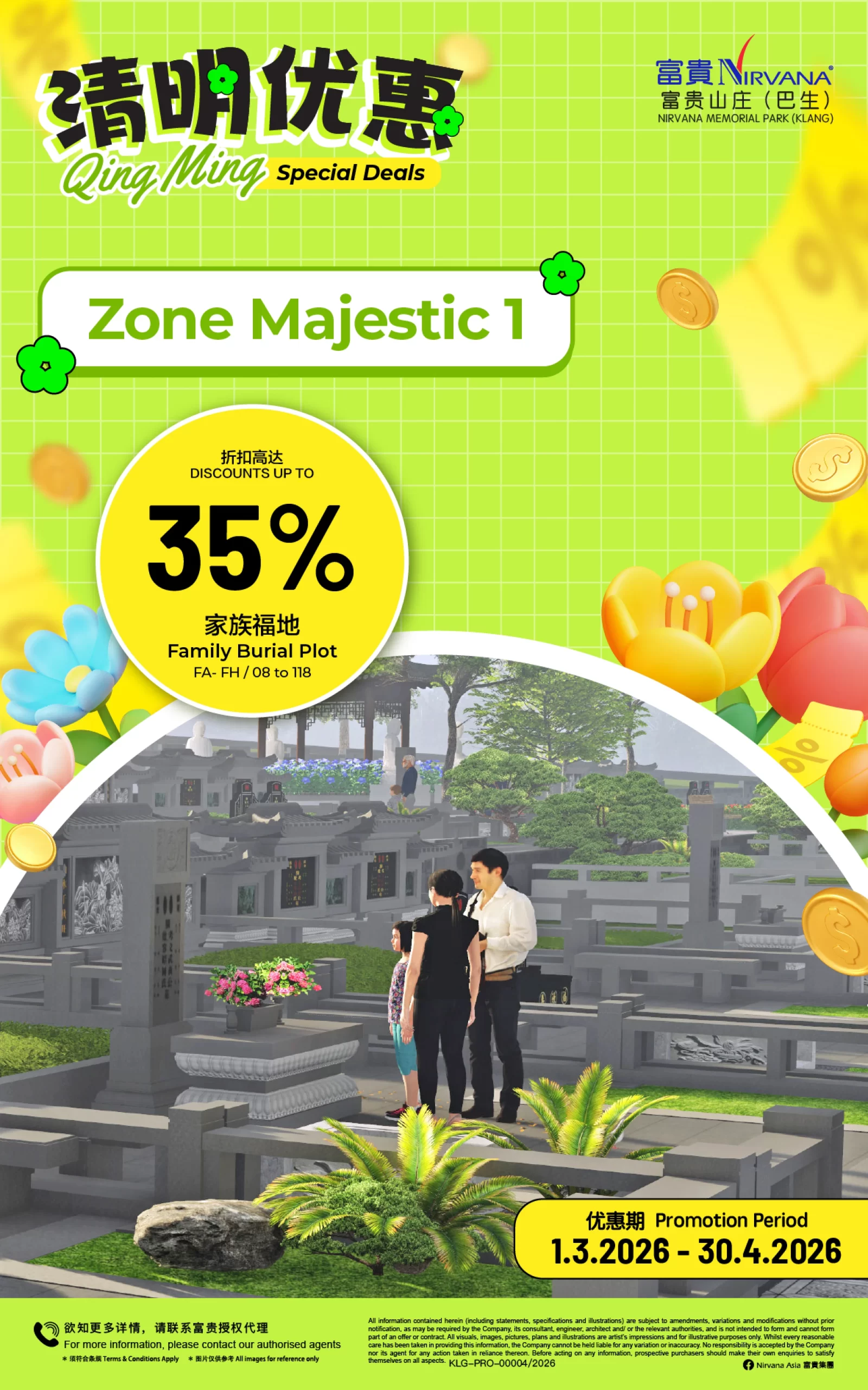 Nirvana Memorial Garden comes with a variety of burial plot choices. Family plot, Double plots, Single plots, all featuring different tomb designs located at good Fengshui land.